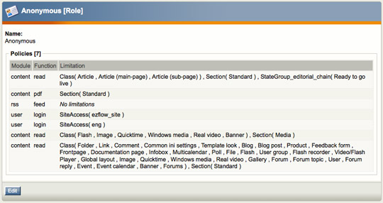 The anonymous role, in our simplistic proof of concept, shall be altered to properly reflect the editorial process. Indeed, the built-in Anonymous role gives read access on about any content in the standard section, with absolutely no restriction on the Object States. Hence the need to make sure all content classes involved in the editorial process are only visible when their instances are in the “Ready to go live” state. Here is our modified Anonymous role, assuming that only Article, Article (main-page), Article (sub-page) are used by the editors: