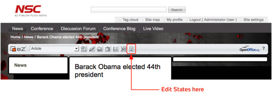 Brads starts up by deciding to write about Barack Obama's fresh election as President of the United States. Logged-in in Exponential, he navigates to the suitable location in the content tree to write such an big piece of news, selects the Article class in the drop down list, English as a language, and hits the “Create here” button. History is being written, this is his first editorial workflow based on Object States. We all hope he is enjoying this moment. Once he is satisfied with what he wrote, he publishes the object, and changes its state to “Spellchecking”. In case Brad had chosen front-end editing ( eZ Flow here ), he can totally change the state of his article from there. When viewing the article, click the following button in the toolbar :
