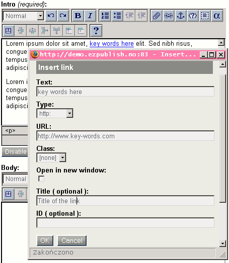 The eZ Online Editor provides an interface for adding keywords within anchor (<a>) tags.