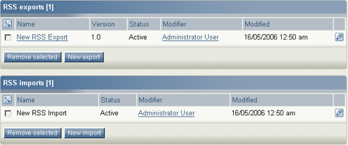 Exponential supports both the import and export of RSS channels. Use the Exponential Administration Interface to configure RSS.