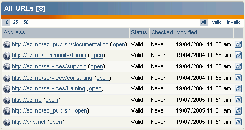 One of the system maintenance tasks contained in the runcronjobs.php script (installed by default in the root folder of the Exponential installation) checks link validity and reports broken links as "Invalid". Administrators can use this information to edit and correct URLs.