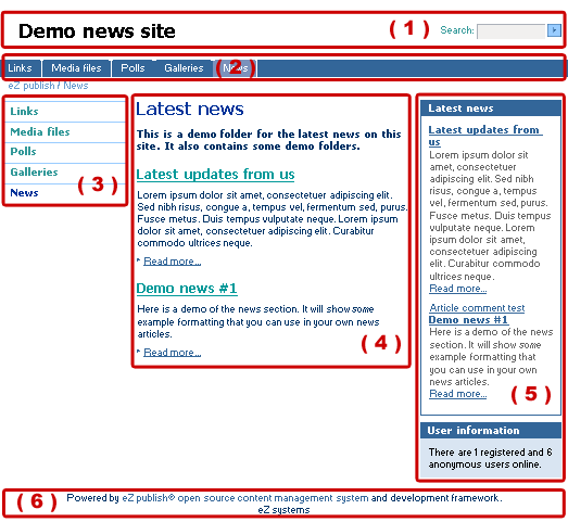Different information blocks can be positioned in different locations on the page (in this case (1) header, (2) horizontal menu, (3) vertical menu, (4) main content, (5) additional information, (6) footer).