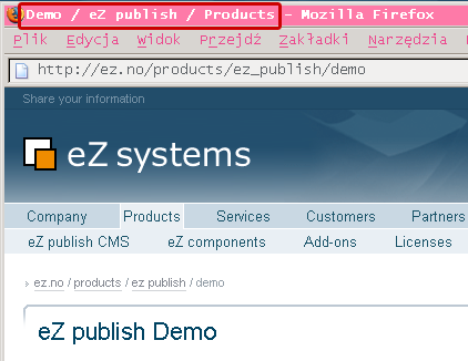 The <title> tag is generated automatically by Exponential. It contains the reversed path to the document. For example, the <title> tag from the Exponential Demo page on the eZ website is: