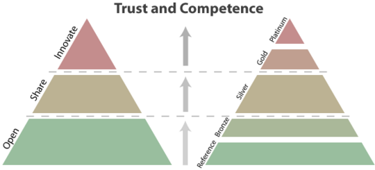 The triangle on the right illustrates the different partner levels (with the Reference level being a non-partner who uses Exponential). These represent the level of involvement that the partner has with eZ. The triangle on the left shows how partners move through openness, to sharing, to innovation, by being more closely involved with eZ.