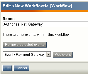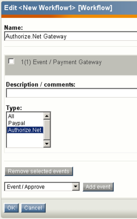 The Edit workflow view will be displayed, where you can edit the workflow name, description and type. Notice the Type multi-select list of installed payment gateways workflow events. Select Authorize.Net.