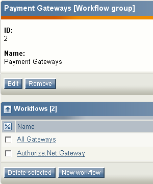The workflows associated with the workflow group 'Payment Gateways' will be displayed. Add a new workflow to the workflow group by clicking the New workflow button.