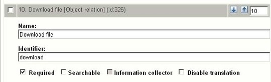 At the bottom of the "Class edit" interface for the "Product" class, add a new attribute of the "Object relation" type. Name the attribute "Download file" with an identifier "download". For our purposes, we will make this attribute required but not searchable.