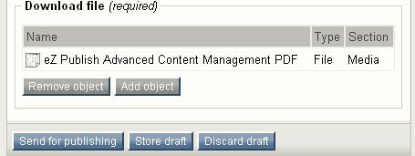 The reason why we are using an attribute of the "Object relation" datatype is so that we can store the actual files in a location of the content tree separate from products. The products can be viewed by everybody, but access to the download files will, by default, be prohibited to the general public and granted to buyers as needed.