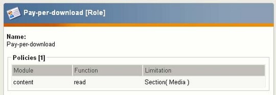 Now, let's create create a role that will provide access to the files associated with purchased products. Under the "User accounts" tab in the Administration Interface, click the "Roles and policies" link in the left menu. Then, create a new role called "Pay-per-download" that has a policy giving permission to the "read" function of the "content" module under the "Media" section.