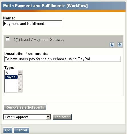 When viewing the new workflow group, click the "New workflow" button. Name the workflow "Payment and Fulfillment", select "Event / Payment Gateway" from the dropdown list, and click the "Add event" button.