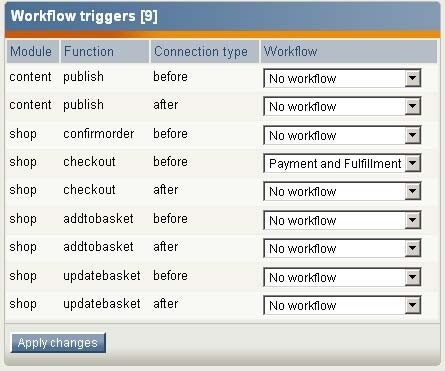 Your new workflow can now be assigned to the appropriate trigger. Click the "Triggers" link in the left menu, then select "Payment and Fulfillment" as the workflow to run before the "checkout" function of the "shop" module.