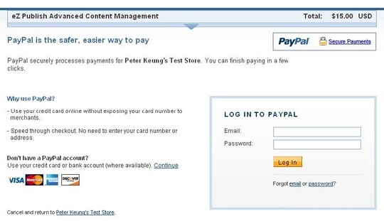 In our example, we are requiring buyers to pay via PayPal before they can access the downloadable products. The eZ PayPal account is a workflow event that will be triggered at the correct step in the checkout process. It will handle the payment process on the PayPal site and return to the example site upon successful payment.