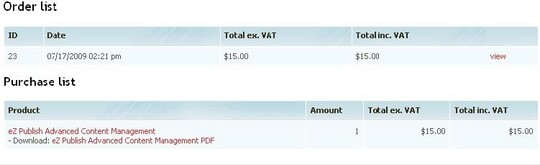 The same download link from the confirmation e-mail should also be given on the order confirmation page (the last page shown in the checkout process). The default file used, and to be overridden in a design extension, is located at extension/ezwebin/design/ezwebin/templates/shop/orderview.tpl. The existing code loops through each purchased product in a table: